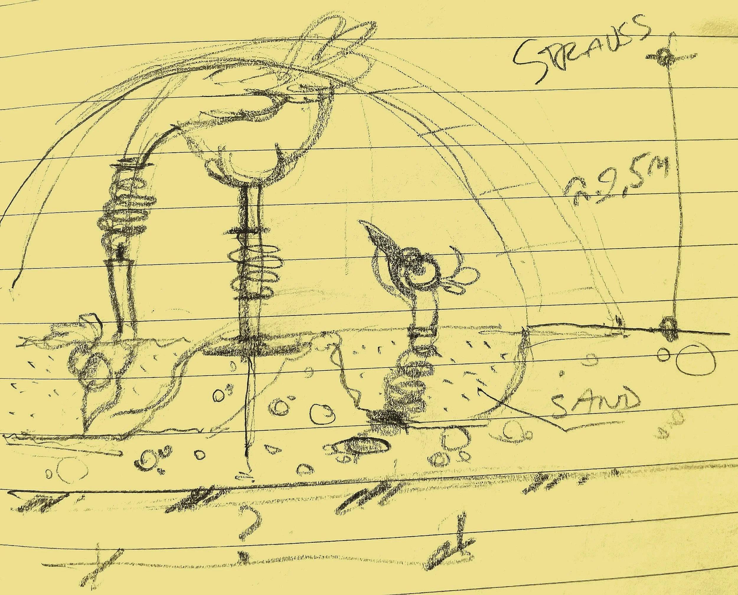 Kids can dig out its head and stretch it with a springy twist, or find one cheekily peeking at its own behind. There’s a bench around the edge for sitting, and a cozy spot inside the ostrich where little ones can sit while parents hold on. Made from wood and steel with flexible parts for extra fun. Colors and details can change to fit the place—this bird likes to dress up!